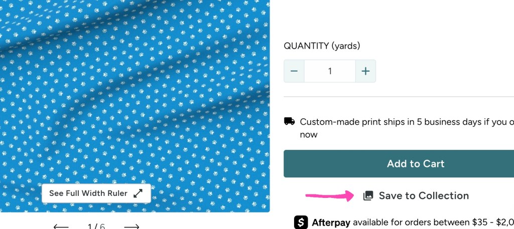 You can do this at any time and add it to your cart while you wait for a sale. Know that you have time to think about your choices. Another sale will come along shortly so try not to pressure yourself to decide quickly. Bookmark any artist you love if you’re using their collection just in case. Buy what you need for your project, since it’s eco-friendly print to order, patterns you love today will still be there later. No FOMO here!