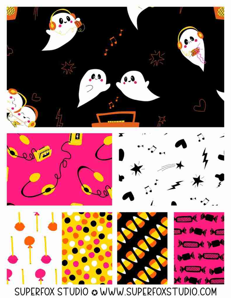 It started with this quick sketch on paper inspired by Spoonflower’s Retro Halloween design challenge. The moment the ghosties with cassette players appeared on the page, I was smitten! That first pattern came together quickly and set the tone for the entire cute Halloween fabric collection.