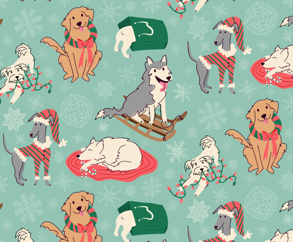 To color the design, I used the same pastel holiday color palette from my Nutcracker fabric designs – peppermint pink, mint green, and pops of holiday red. I scattered snowflakes to create a soft winter background to balance the chaos and cuteness of the dogs.