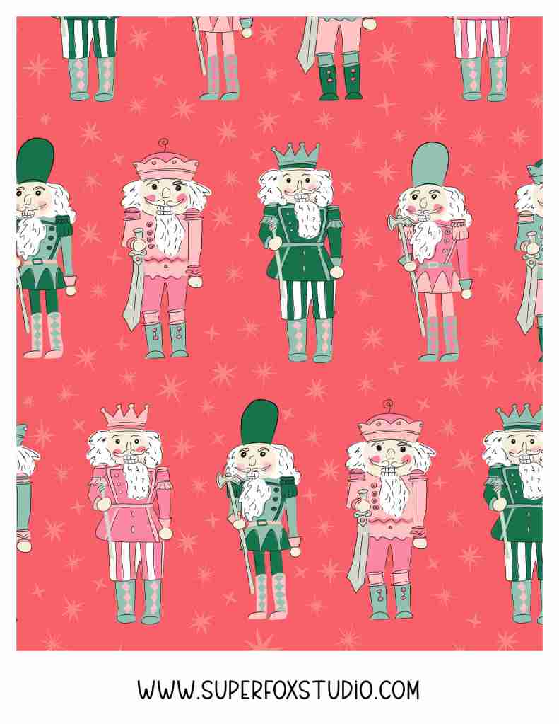 While I’m not quite there for the full story, I decided that those nutcrackers needed to come to life. Add in a twist on the traditional Christmas color scheme with some peppermint pink and mint green and let the magic begin! These modern pink nutcracker fabric designs are perfect for holiday makes.